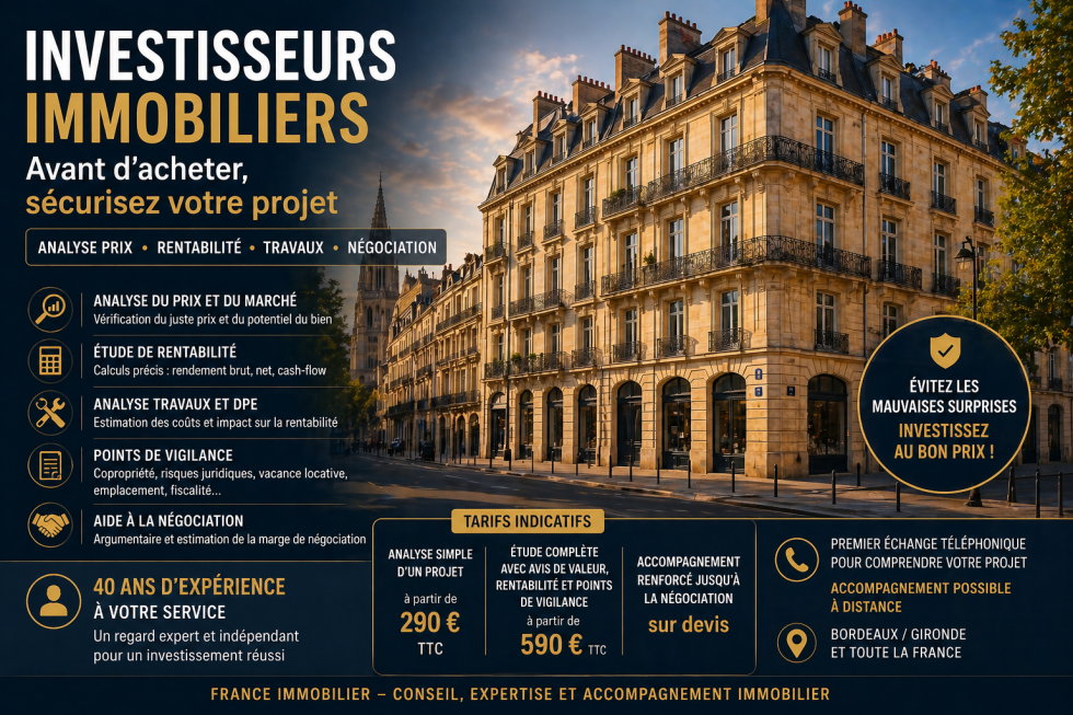 Vous souhatez investir dans l'immobilier mais vous hésitez sur le bien, le secteur, le prix ou la rentabilité réelle ? Avec près de 40 ans d'expérience dans l'immoblier, je vous accompagne avant votre achat pour sécuriser votre décision. J'interviens notamment pour - Analyser le prix demandé, - vérifier le cohérence du projet - estimer la rentabilité locative - repérer les risques : travaux, DPE, copropriété, emplacement, vacance locative, - vous aidez à négocier au juste prix, - vous éviter un achat surévalué ou mal calibré. Cet accompagnement s'adresse aux investisseurs débutants comme confirmés, avant signature d'une offre ou d'un compromis. Je ne vends pas un bien : je vous aide à prendre une décision éclairée. Tarifs indicatifs : Ananlyse simole d'un projet : à partir de 290 € TTC Etude complète avec avis de valeur, rentabilité et points de vigilance : à partir de 590 € TTC Acompagnement renforcé jusqu'à la négociation : sur devis.